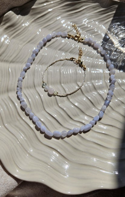 wunderschönes und einzigartiges Armband aus Edelsteinen und Süßwasserperlen. Dazu gehören, Sonnenstein, Chalcedon und Prehnit.